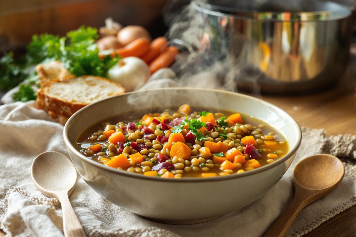 Imaginez une soupe fumante, doucement mijotée, avec des parfums qui évoquent les cuisines familiales d’hiver. Une cuillère, et tout le monde se tait. Cette soupe lentilles-lardons, simple et économique, fait tout bonnement l’effet d’un câlin dans un bol. À moins de 2 € par portion, elle pourrait bien devenir votre meilleure alliée des soirées froides. Voici pourquoi vous allez vite l’adopter.